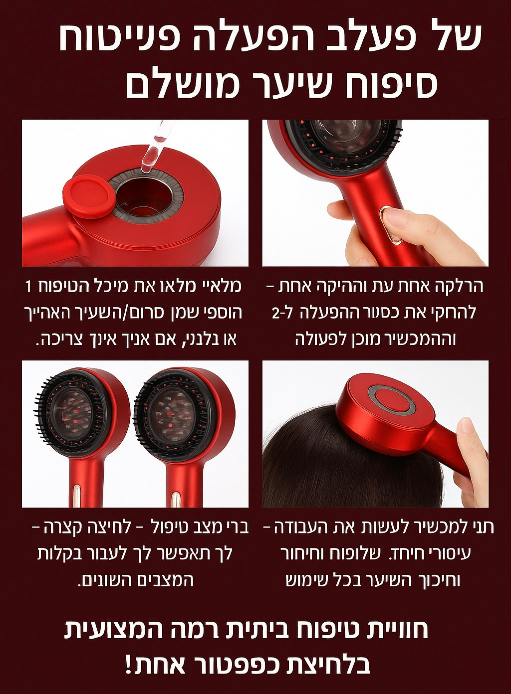 המסרק מבוסס על טכנולוגיה חדשניתנגנון פעולה מדויק לחיזוק זקיקי השיער המזרימה את השמן הפעיל ישירות לקרקפת, מבלי לבזבז חומר על השיער עצמו. כך מקבלים טיפול ממוקד בבעיה – חיזוק זקיקי השיער, שיפור זרימת הדם בקרקפת ועידוד צמיחה טבעית.